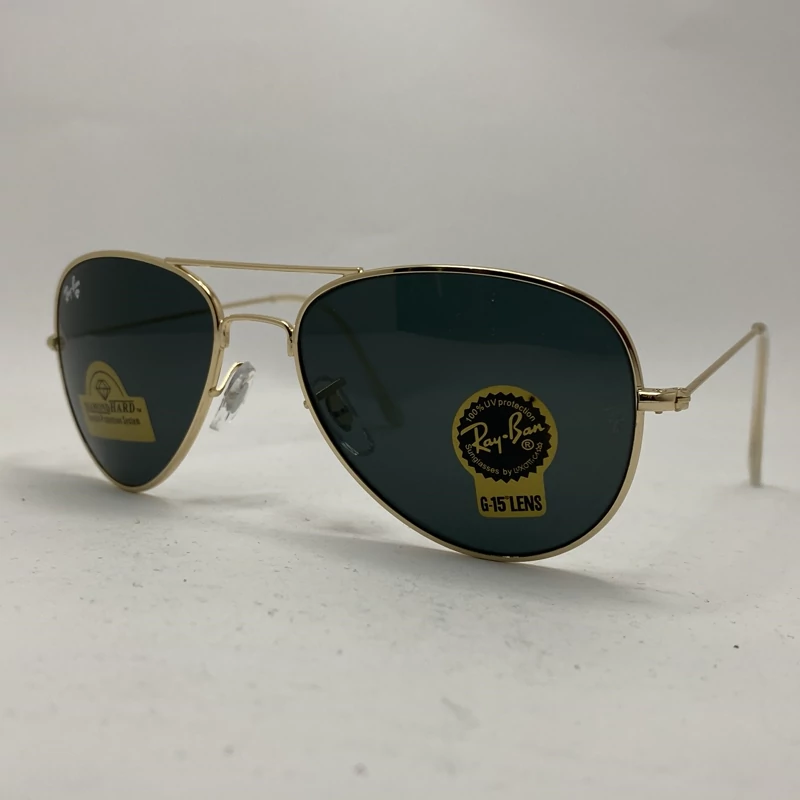 عینک آفتابی خلبانی AVIATOR ریبن rayban شیشه سنگ طلایی سبز سایز 3026 فول پک اورجینال