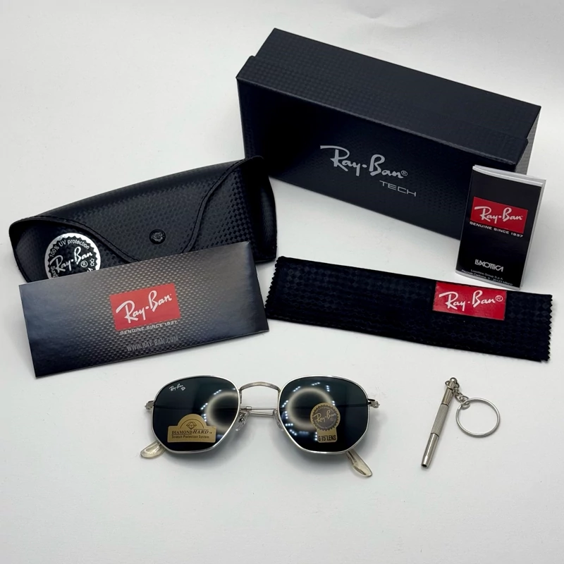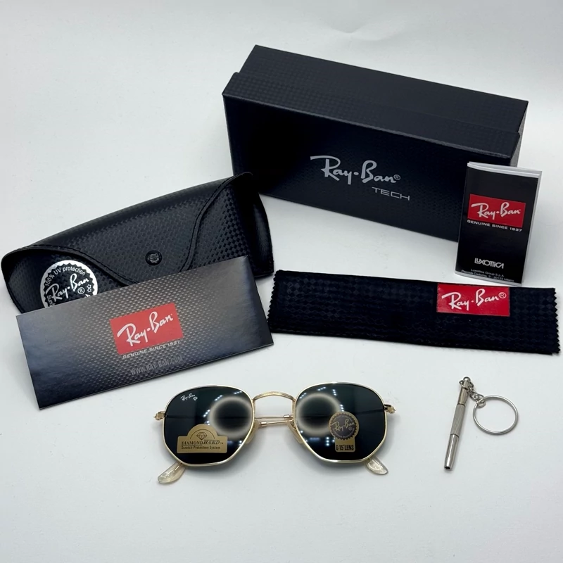 عینک ریبن هگزونال شیشه سنگ فریم نوک مدادی عدسی مشکی به همراه پک کامل ریبن کد Rayban RB 3548