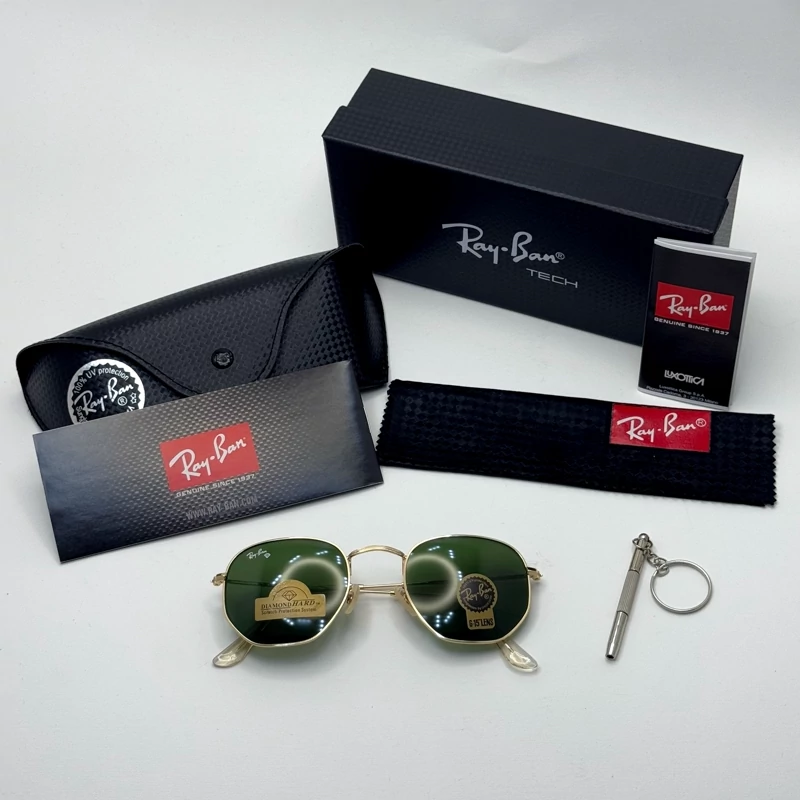 عینک ریبن هگزونال شیشه سنگ سیز فریم طلایی به همراه پک کامل ریبن کد Rayban RB 3548