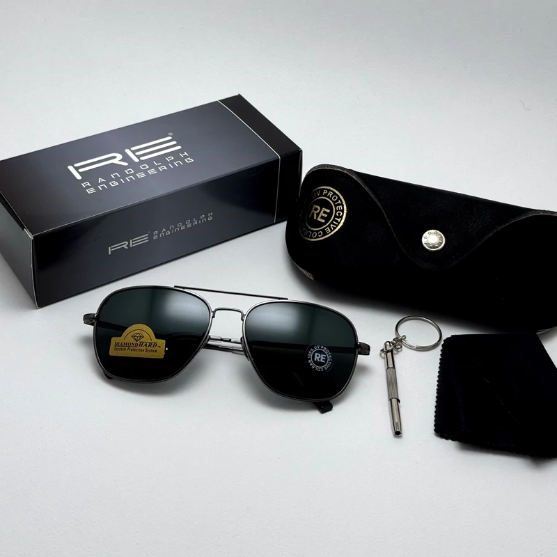عینک آفتابی خلبانی رندولف شیشه سنگ آنتی رفلکس مشکی فریم نوک مدادی فول پک RANDOLPH AVIATOR RE 58 24K WHITE GOLD