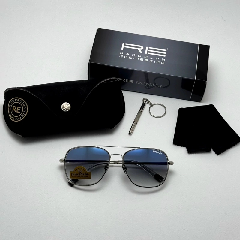 عینک آفتابی خلبانی رندولف شیشه سنگ آنتی رفلکس آبی هایلایت نقره ای فول پک RANDOLPH AVIATOR RE 58 24K WHITE GOLD
