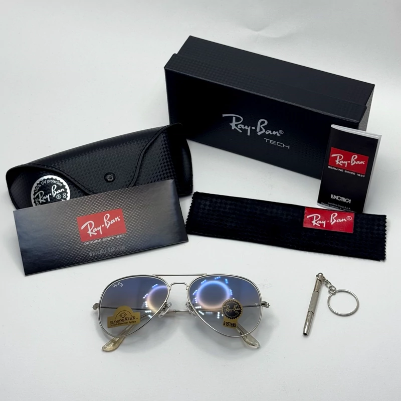 تصویر عینک ریبن خلبانی شیشه سنگ آبی هایلایت فریم نقره ای به همراه پک کامل ریبن Rayban RB 3025