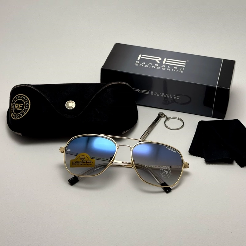 عینک آفتابی خلبانی رندولف شیشه سنگ آنتی رفلکس آبی هایلایت فریم طلایی فول پک اصلی RANDOLPH AVIATOR RE 58 24K GOLD