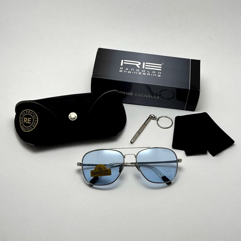 عینک شب و آفتابی خلبانی رندولف شیشه سنگ آبی آسمانی نقره ای فول پک RANDOLPH AVIATOR RE 58 24K WHITE GOLD